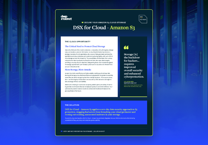 S3リポジトリ全体のセキュリティは、DSX for Cloud – Amazon S3から始まります。DSX for Cloud – Amazon S3には、マルウェアが実行前に阻止できるように設計された、サイバーセキュリティ専用に開発された世界初かつ唯一のディープラーニング フレームワークお活用したDSX Brainが搭載されています。