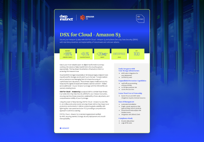 Deep Instinct DSXは、高度なディープラーニングと生成AIテクノロジーを活用した唯一のZero-Day Data Security(ZDDS)ソリューションです。比類のない防御力、リアルタイムの判定、詳細な説明能力を備えたDSXは、お客様のデータ全体にわたってゼロデイ攻撃に対する比類ない保護を提供します。